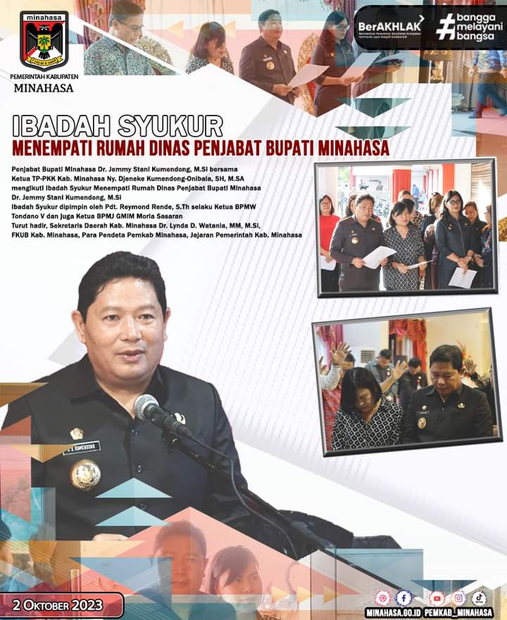 MINAHASA,inforakyatnews.com- Penjabat Bupati Minahasa, Dr Jemmy S. Kumendong didampingi istri tercinta, Ny Djeneke Kumendong-Onibala, melaksanakan ibadah syukur menempati Rumah Dinas (Rudis) Bupati Minahasa di Kelurahan Sasaran,...