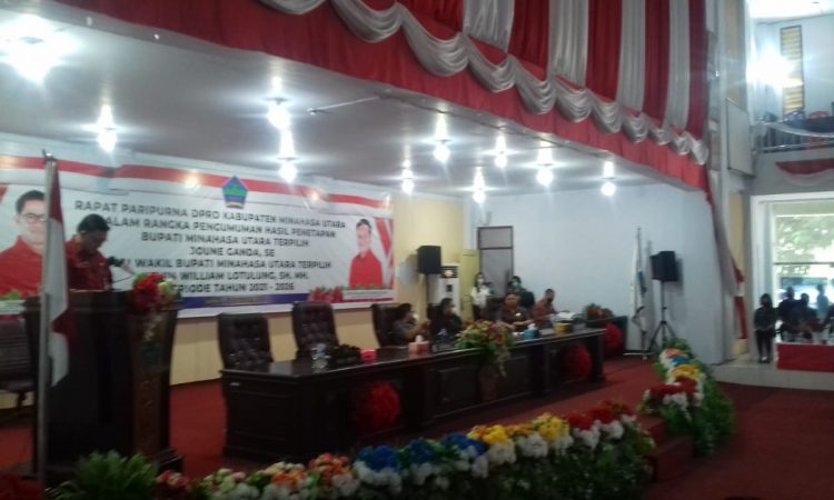 InfoRakyatNews.com, Minut – DPRD Kabupaten Minahasa Utara (Minut) menggelar Rapat Paripurna dalam rangka pengumuman hasil penetapan Bupati dan Wakil Bupati Minahasa Utara terpilih Joune Ganda, SE dan Kevin William Lotulung, SE.MH periode tahun 2021-2026,