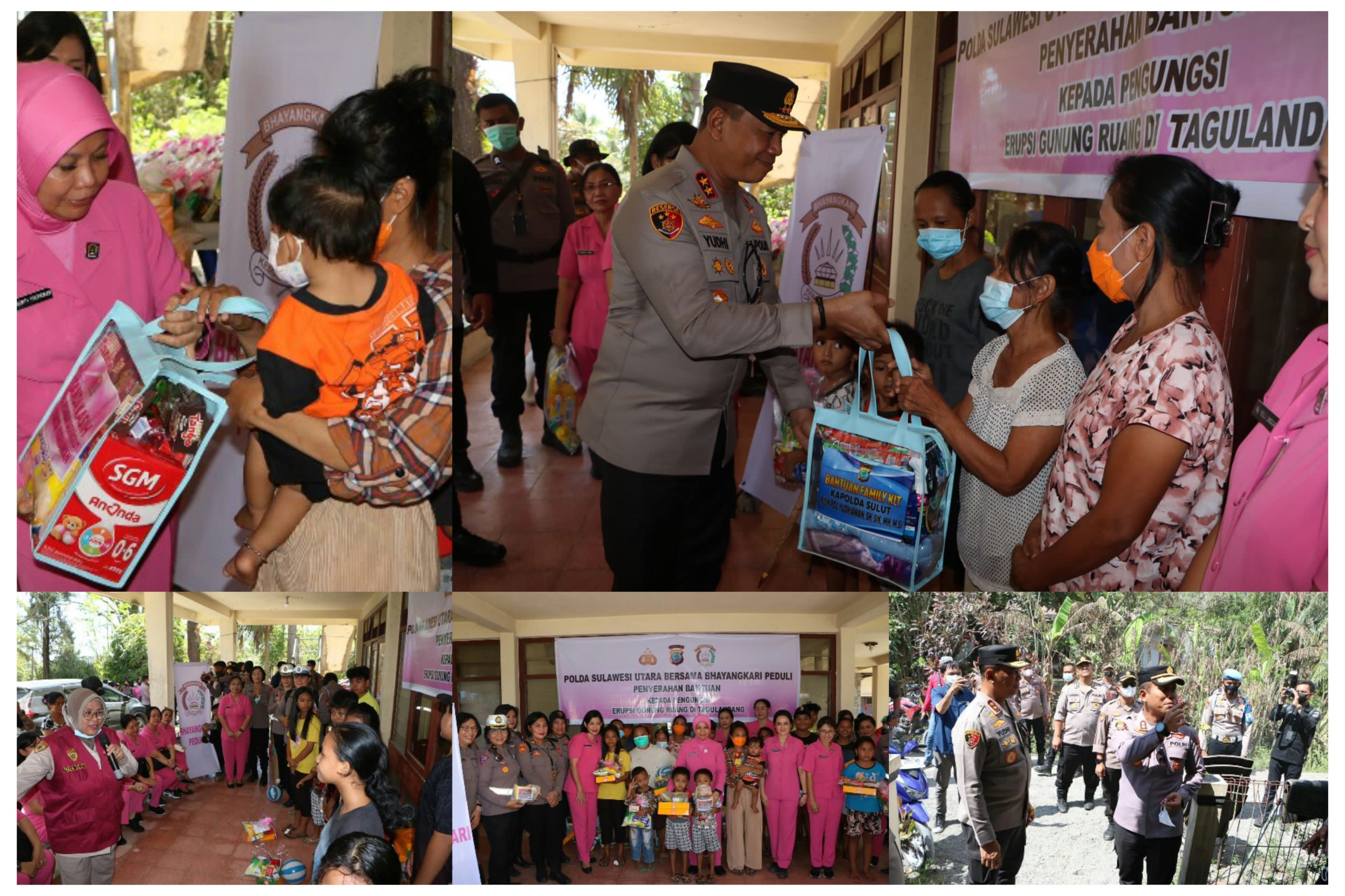 SULUT, inforakyatnews.com – Polda Sulawesi Utara dan Bhayangkari terus memberikan perhatian kepada warga pengungsi yang terdampak erupsi Gunung Ruang, di Kecamatan Tagulandang.