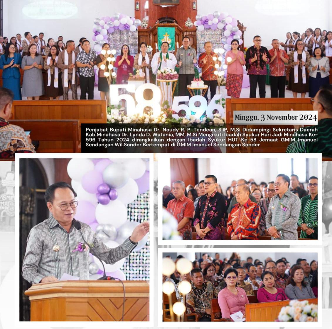 menghadiri Ibadah Syukur Hari Jadi Minahasa Ke-596 Tahun 2024 dirangkaikan dengan Ibadah Syukur HUT Ke-58 Jemaat GMIM Imanuel Sendangan Wilayah Sonder Bertempat di GMIM Imanuel Sendangan Sonder, Minggu (3/11/2024).