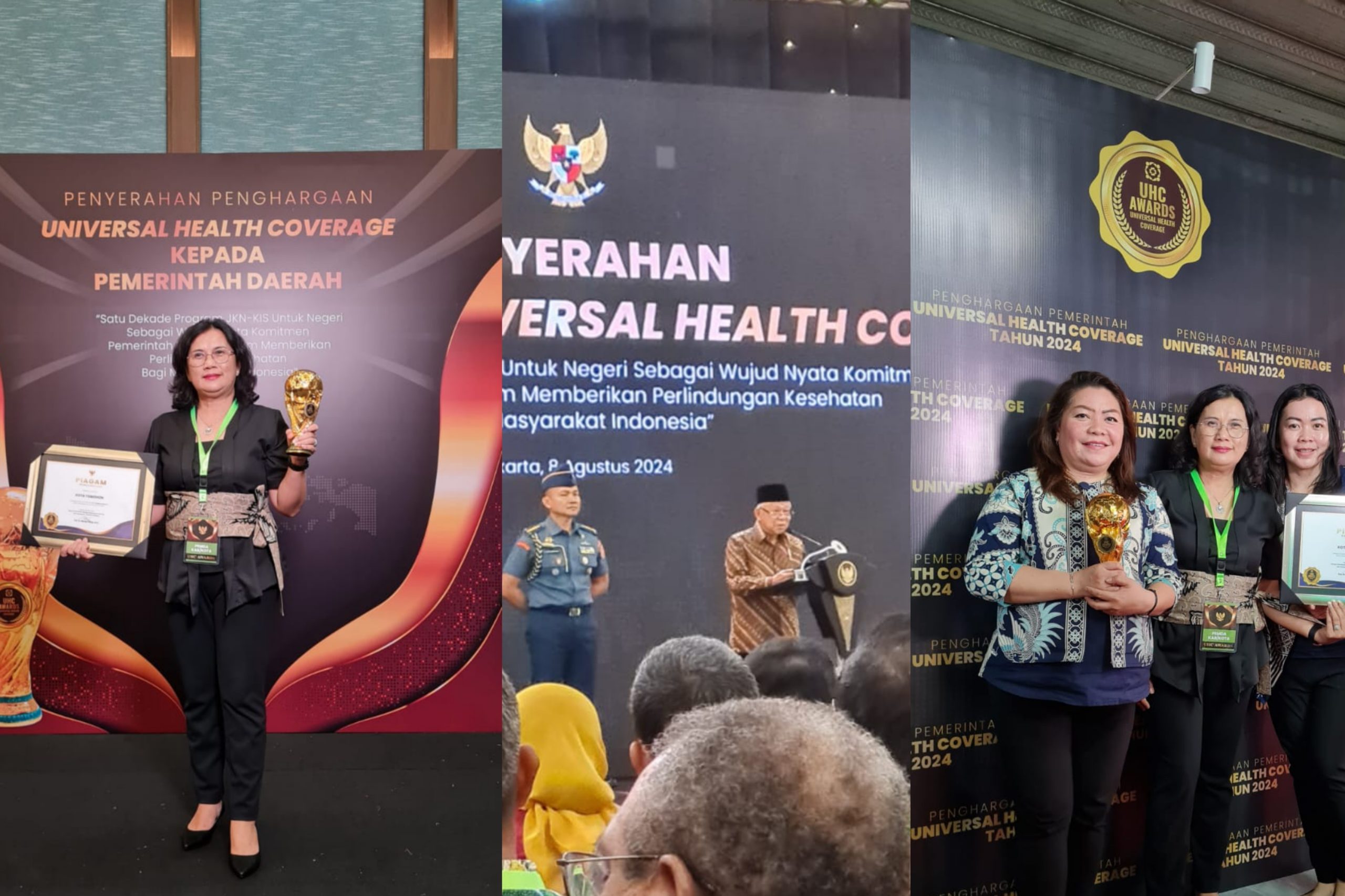 TOMOHON, inforakyatnews.com – Wakil Presiden Republik Indonesia, Ma’ruf Amin, memberikan penghargaan kepada kepala daerah dari 33 provinsi dan 460 kabupaten/kota di Indonesia yang telah berhasil meraih predikat Universal Health Coverage (UHC), di Krakatau Grand Ballroom Jakarta Timur, Kamis (08/08/2024)