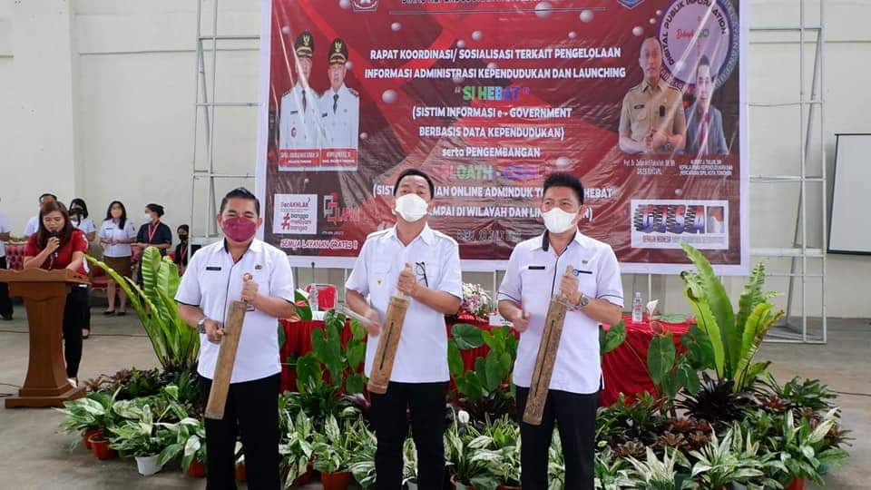 Walikota Tomohon bersama Sekretaris Dinas Kependudukan Pencatatan Sipil dan Keluarga Berencana Drs. Wendy Karwur, M.A.P. serta Kepala Dinas Kependudukan dan Pencatatan Sipil Kota Tomohon bersama-samanya memukul tetengkoren tanda di launchingnya aplikasi SI HEBAT (Sistem Informasi e-Government Berbasis Data Kependudukan) serta Pengembangan SLOATH-CSWL (Sistem Layanan Online Adminduk Tomohon Hebat Cepat Sampai di Wilayah dan Lingkungan).