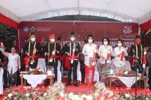 TOMOHON, inforakyatnews.com – Genderang kebangkitan pariwisata ditabuh, iven tahunan pesta bunga kembali berkumandang tampak dengan di Launchingnya Tomohon International Flower Festival (TIFF) 2022 ditandai dengan pemukulan Tetengkoren (Tetengkoren adalah musik pukul tradisional atau diafon yang terbuat dari bambu berbentuk tabung bambu) yang berlangsung dilapangan Babe Palar Kota Tomohon. (13/5) 2022.