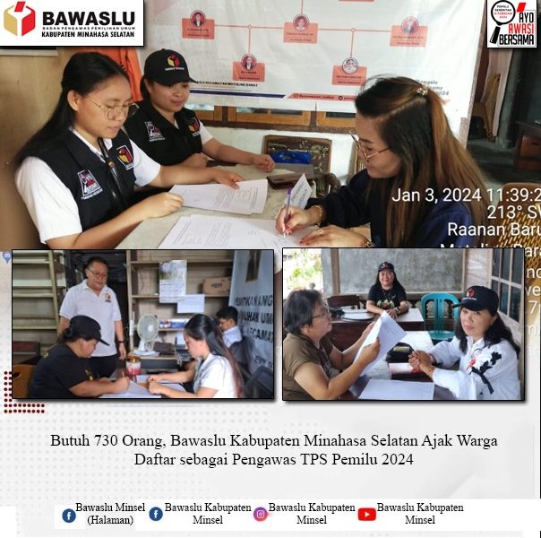 AMURANG, INFORAKYATNEWS.COM– Sekira 730 orang dibutuhkan Badan Pengawas Pemilihan Umum (Bawaslu) Kabupaten Minahasa Selatan (Minsel) untuk menjadi Pengawas Tempat Pemungutan Suara (PTPS). Pimpinan Bawaslu Minsel Ketua...