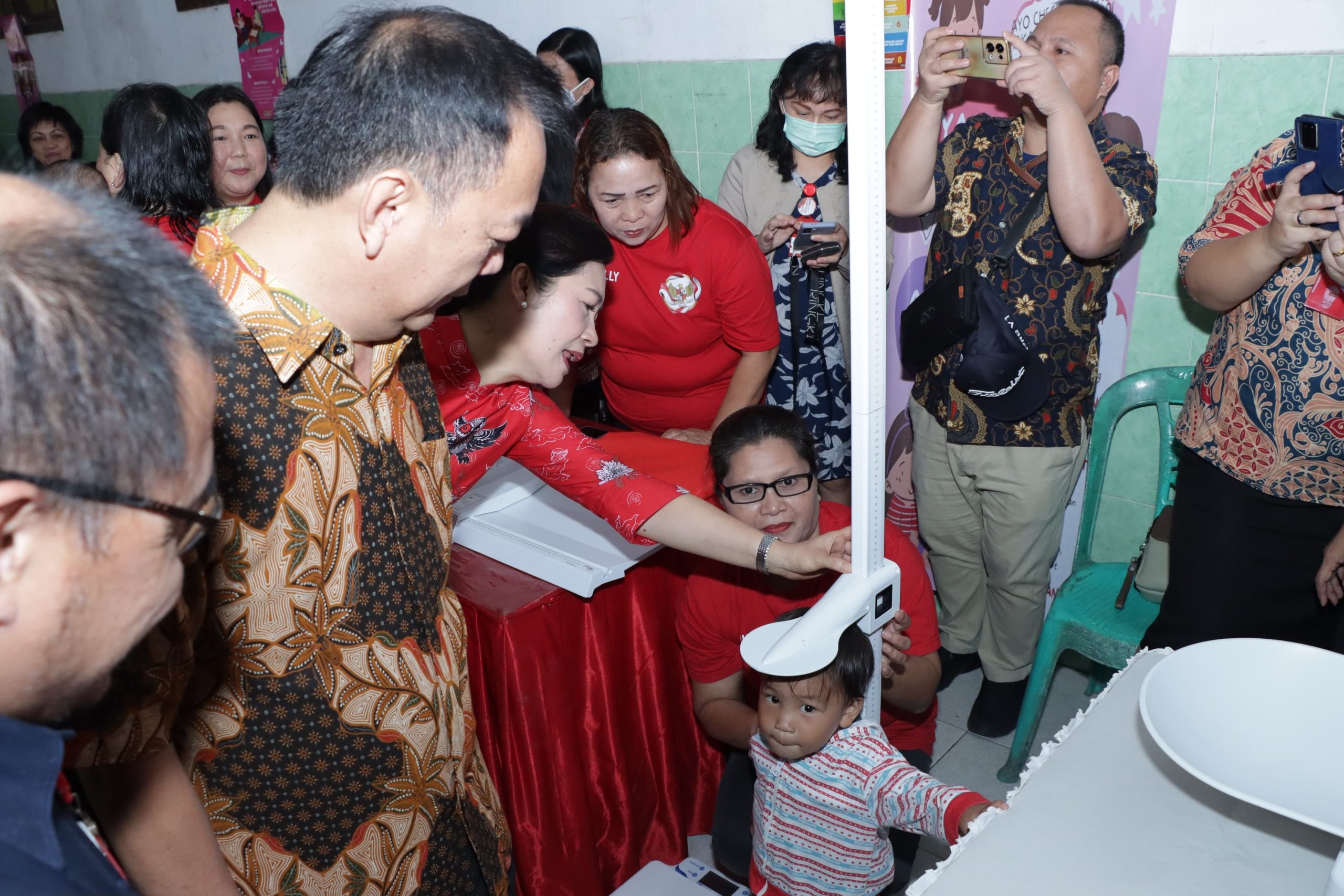 Walikota Tomohon juga menyerahkan secara simbolis bantuan kepada anak anak stunting di Kecamatan Tomohon Utara serta meninjau langsung Posyandu Balita Kelurahan Kakaskase 2.