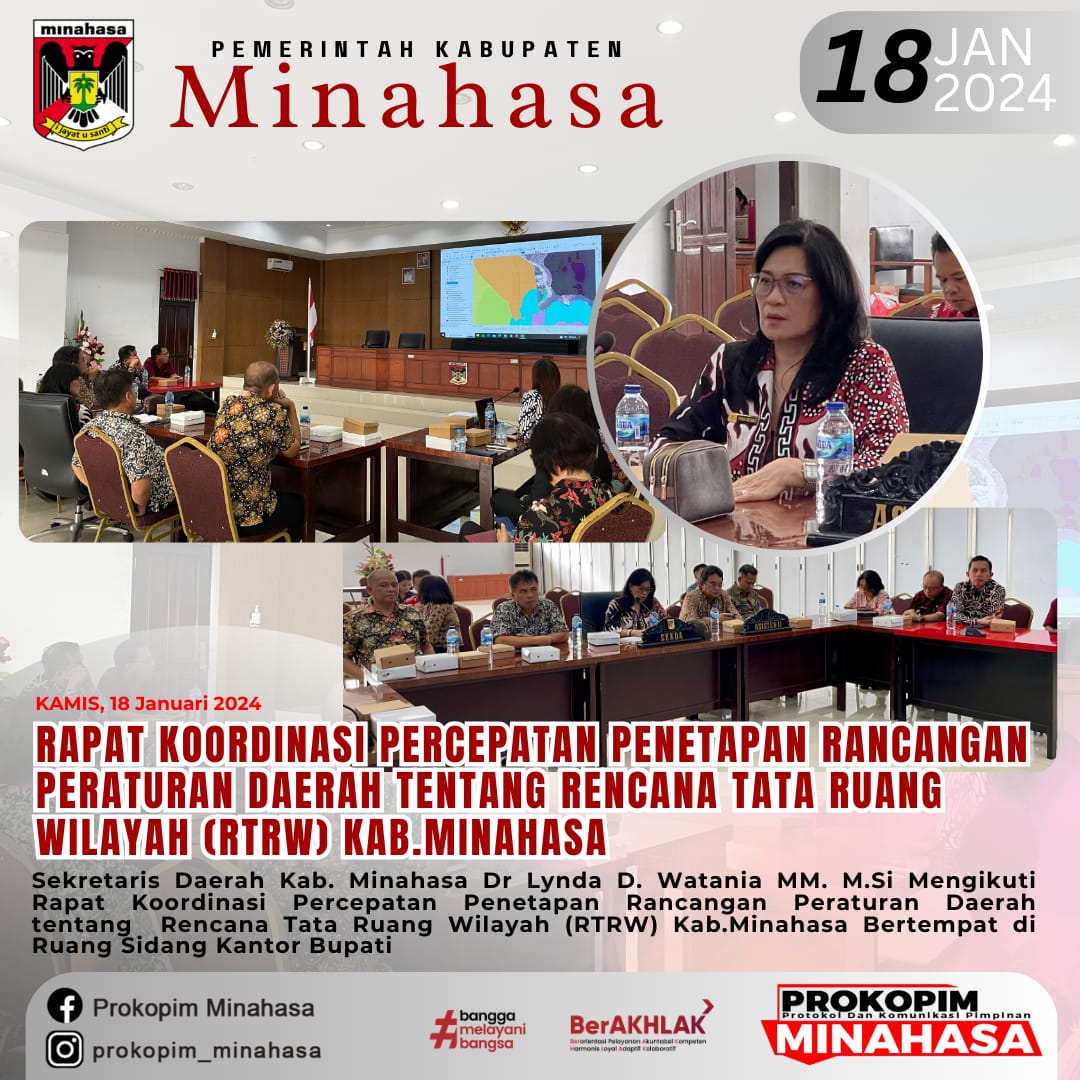 MINAHASA,inforakyatnews com – Sekretaris Daerah Kabupaten Minahasa Dr Lynda D. Watania MM. M.Si, Mengikuti Rapat Koordinasi Percepatan Penetapan Rancangan Peraturan Daerah tentang Rencana Tata Ruang Wilayah (RTRW) Kabupaten Minahasa. Bertempat di Ruang Sidang Kantor Bupati, Kamis (18/1/24).