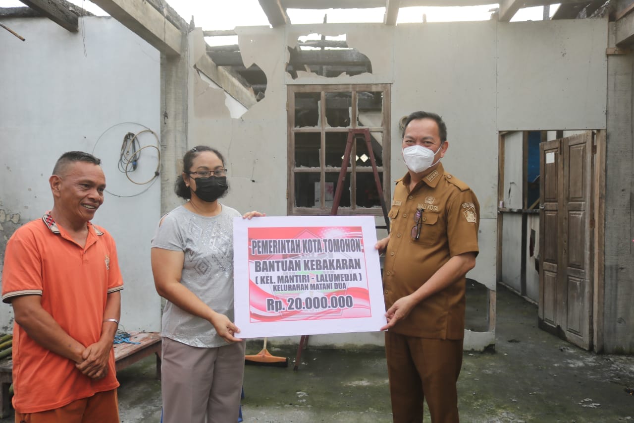 TOMOHON, inforakyatNews.com – Walikota Tomohon Caroll Joram Azarias Senduk SH didampingi Camat Tomohon Tengah dan Lurah Matani Dua menyerahkan langsung bantuan kepada kel. Mantiri – Lalumedja yang menjadi korban musibah kebakaran rumah di kelurahan Matani Dua, Senin 27 Juni 2022.